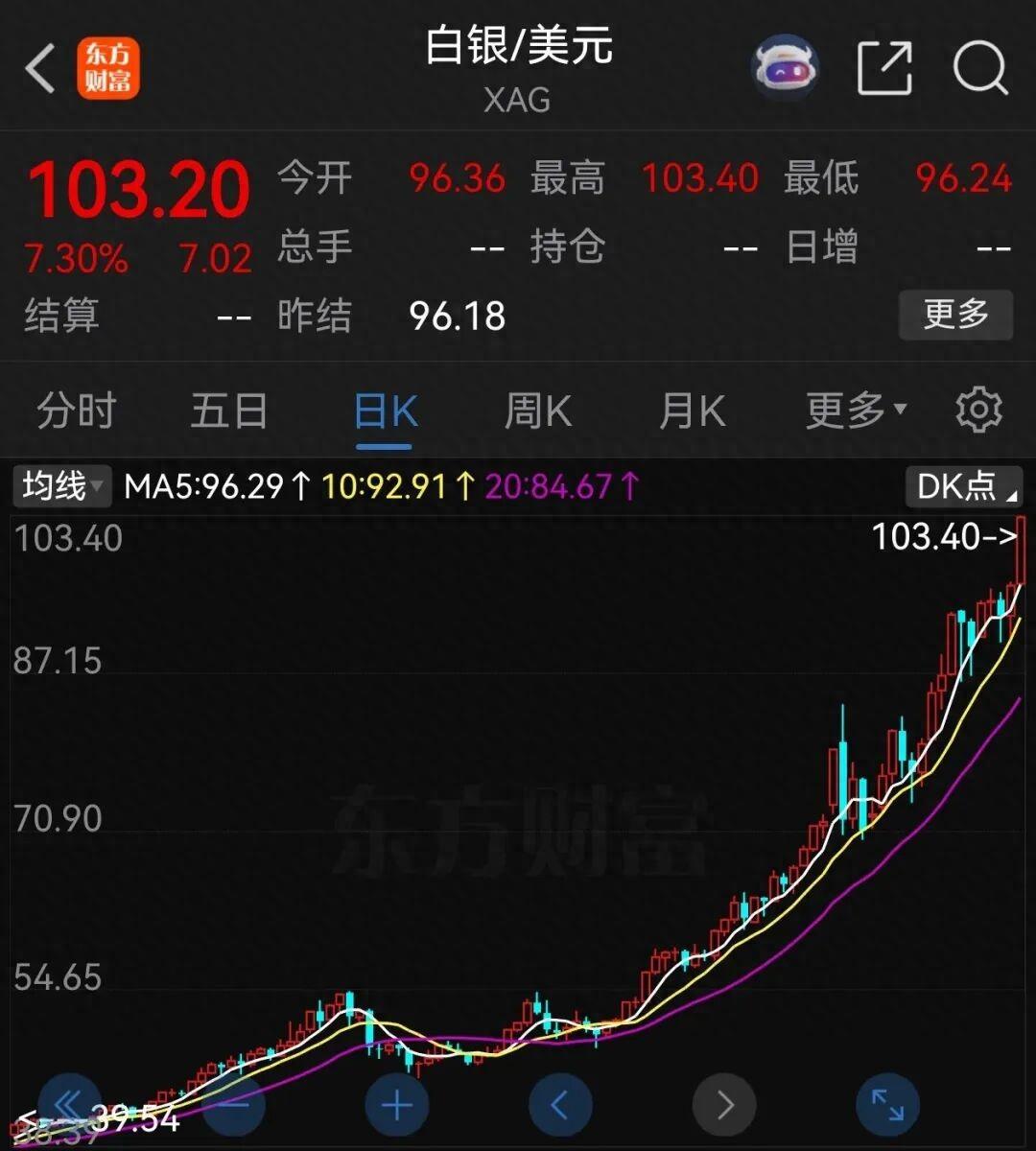 1月24日凌晨,隨着地緣政治風險與美元走弱,貴金屬繼續狂飆,疊加工業需求,現貨白銀漲超7%,最高報約103美元/盎司,再創歷史新高記錄,在去年錄得耀眼的147%年度最佳漲幅後今年以來延續漲勢,本月迄今已漲超40%,多方勢頭只增不減。令人驚歎的不只是幅度,更是神速——紐約白銀自2025年4月的28美元起步,僅用9個多月便一舉突破100美元大關,漲幅超260%。