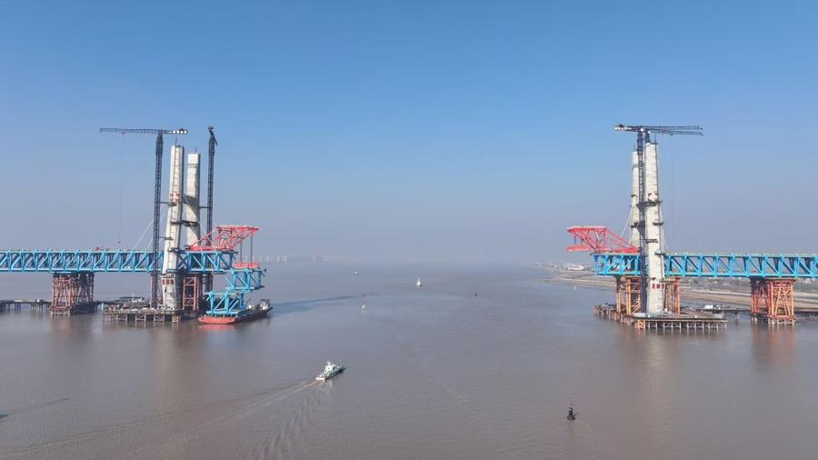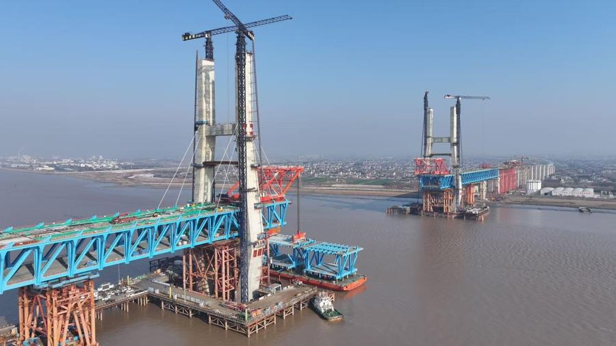 1月24 日11時20分,由中鐵大橋局承建的滬渝蓉高鐵V標崇啓公鐵長江大橋主通航孔“首段”鋼樑精準架設到位,這標誌着這一世界最大跨度無砟軌道公鐵兩用斜拉橋主通航孔吊裝作業正式拉開帷幕,預計於今年5月底完成主通航孔吊裝作業,大橋實現合龍。這一關鍵節點的順利啓幕,標誌着國家“八縱八橫”沿江高鐵通道控制性工程邁入關鍵衝刺階段。