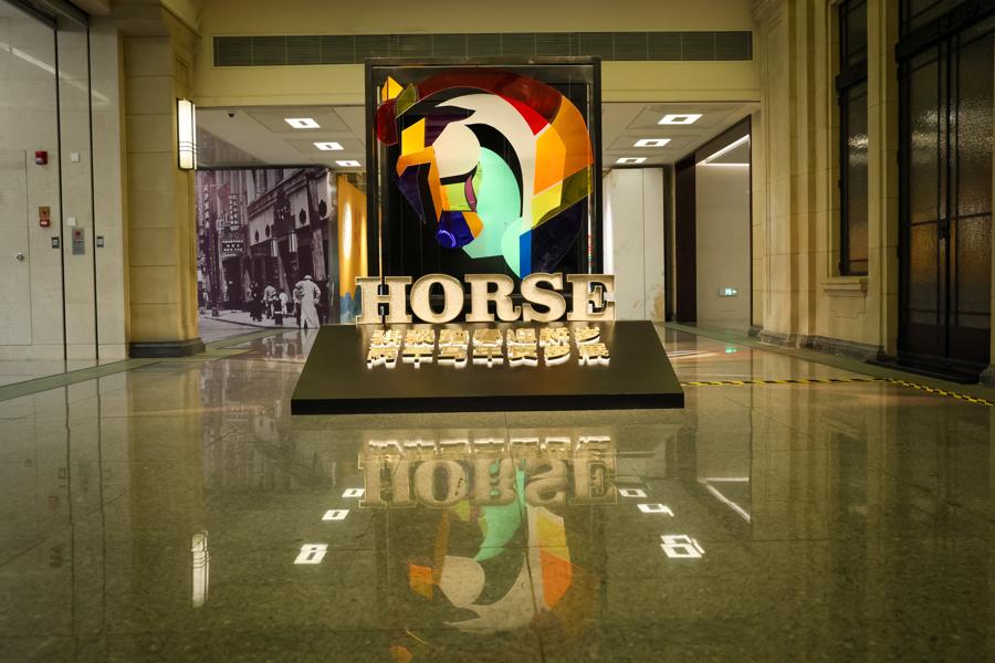 步入展廳,迎面是一件裝置藝術《騏驥踏春》。它由透明亞克力片組成,通過對馬的重構、結構,組成具有現代氣息的馬頭,將人們帶入馬的世界。