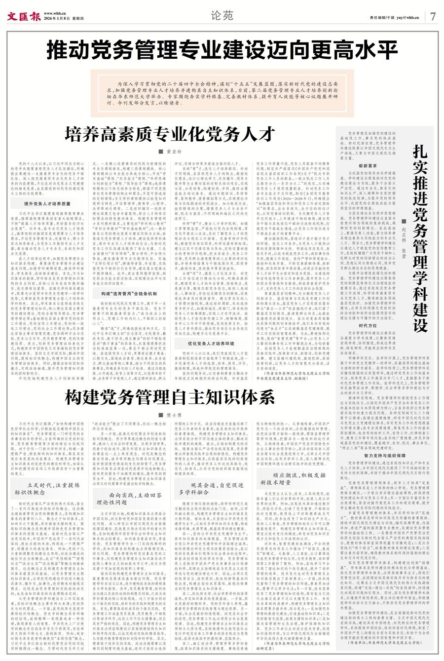 開創性地構建黨務人才創新培養模式。一是精心設置兼具時代性與前瞻性的專業化課程體系,構建三類課程模塊。核心課程模塊以專業能力養成爲核心,開設“學術基礎”課程、“實務能力”課程、“科學思維與創新能力”課程、“領導能力”課程;選修課程模塊以個性化培養爲特色,根據不同類型單位黨務管理的特點和需求,開發可供選擇的定製課程;交叉學科課程模塊以拓寬知識視野爲特色,開設管理學、教育學、心理學、法學等相關課程。二是組織編寫一批既有理論深度又包含豐富案例,契合人才培養實際需求的特色教材體系。構建黨務管理碩士系列教材體系,主要包括“學科核心教材”“學科分佈教材”“學科基礎教材”,這一教材體系以黨的理論發展與建設實踐爲主軸,拓展深化黨務管理人才培養、建設優質學科體系,填補專業化人才培養的空白,爲新時代黨務工作隊伍建設提供了智力支撐。三是全面推行“雙導師制”,聚合學科、平臺兩大勢能,建設高素質專業化教師隊伍。實施“名師引領計劃”,聘請學者型、專家型、實踐型黨務幹部擔任行業導師,建設複合型高水平教師梯隊。此外,突出案例教學優勢,制定職業化能力勝任標準,實現理論水平與實務能力的同向提升。