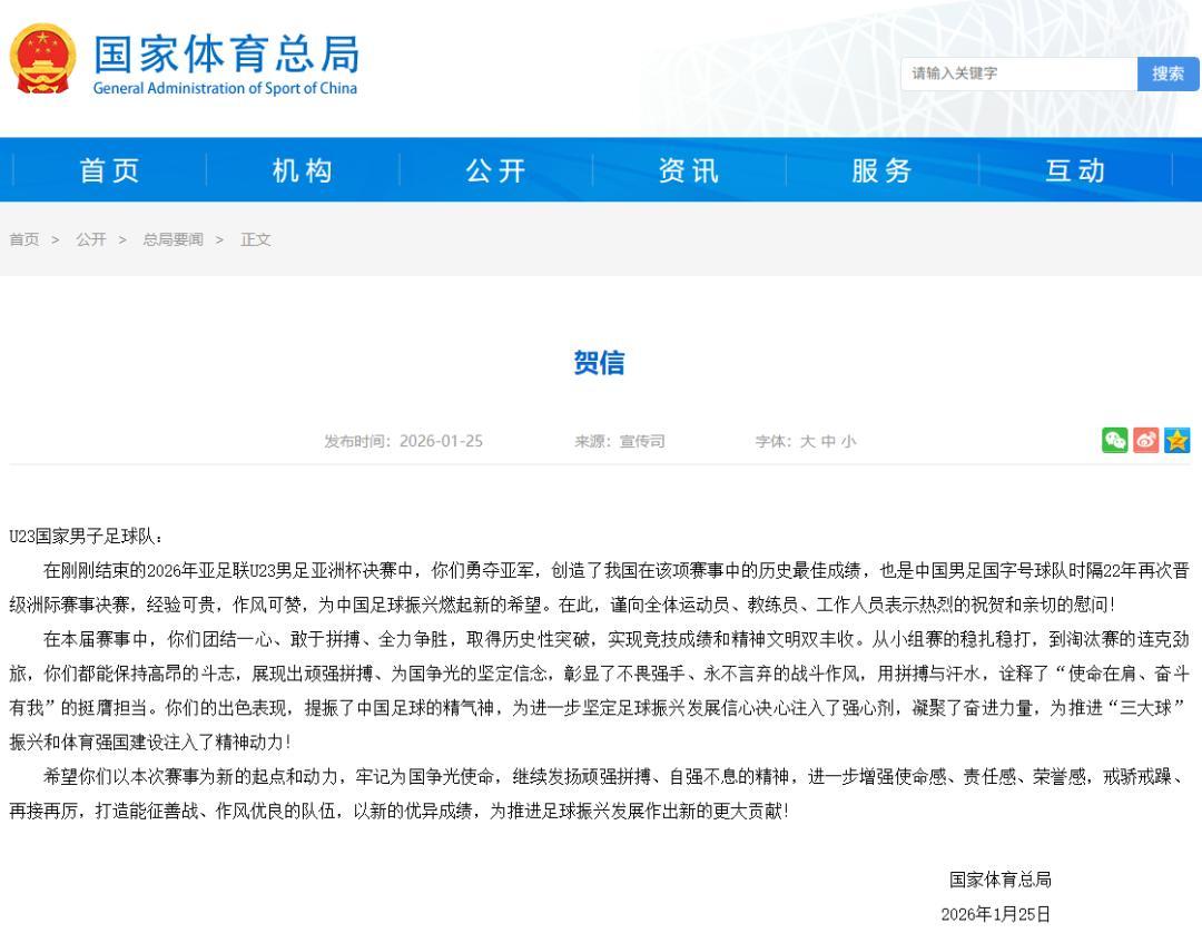 1月25日,國家體育總局向U23國足致賀信。信中稱,U23男足勇奪亞軍“經驗可貴,作風可贊,爲中國足球振興燃起新的希望”。