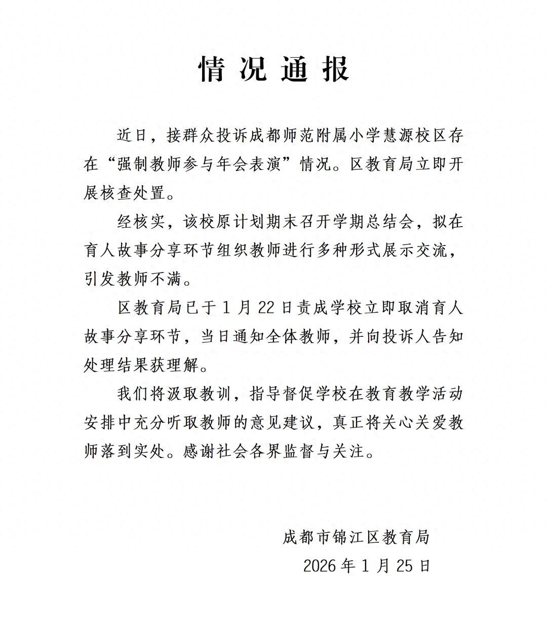 1月25日,成都市錦江區教育局就一小學存在“強制教師參與年會表演”發佈情況通報: