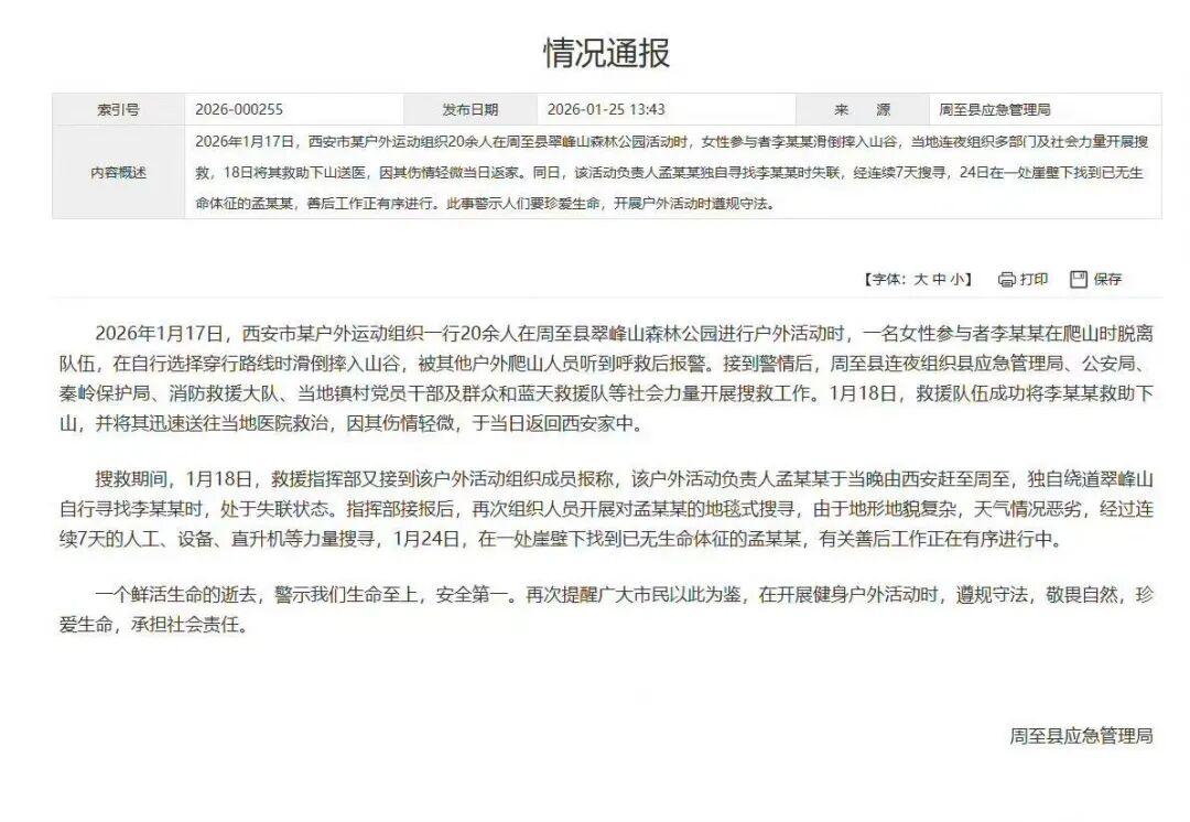 2026年1月17日,西安市某戶外運動組織一行20餘人在周至縣翠峯山森林公園進行戶外活動時,一名女性參與者李某某在爬山時脫離隊伍,在自行選擇穿行路線時滑倒摔入山谷,被其他戶外爬山人員聽到呼救後報警。接到警情後,周至縣連夜組織縣應急管理局、公安局、秦嶺保護局、消防救援大隊、當地鎮村黨員幹部及羣衆和藍天救援隊等社會力量開展搜救工作。1月18日,救援隊伍成功將李某某救助下山,並將其迅速送往當地醫院救治,因其傷情輕微,於當日返回西安家中。