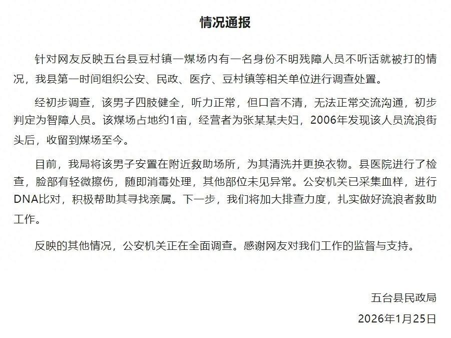 1月25日晚,山西五臺縣民政局發佈情況通報稱,針對網友反映五臺縣豆村鎮一煤場內有一名身份不明殘障人員不聽話就被打的情況,該縣第一時間組織公安、民政、醫療、豆村鎮等相關單位進行調查處置。
