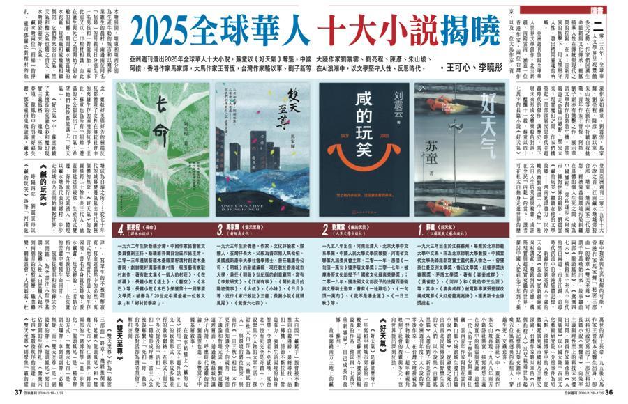 ▷《好天氣》《鹹的玩笑》《長命》等入選《亞洲週刊》2025全球華人十大小說。近日,蘇童的《好天氣》、劉震雲的《鹹的玩笑》、劉亮程的《長命》、陳彥的《人間廣廈》、朱山坡的《蛋鎮詩社》、阿措的《滄城》等作品入圍亞洲週刊》2025全球華人十大小說。