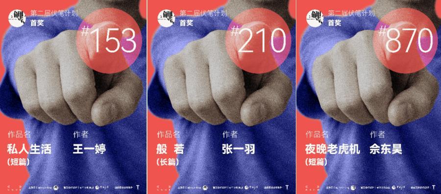 ▷第二屆伏筆計劃首獎揭曉。經過最終評選,153號《私人生活》(作者:王一婷)、210號《般若》(作者:張一羽)、870號《夜晚老虎機》(作者:佘東昊)獲得伏筆計劃首獎。328號《天晴時一起去游泳吧》(作者:思芬)獲特別獎。