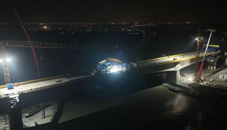 通甬高鐵海鹽特大橋跨呂冢港連續梁位於浙江省嘉興市海鹽縣百步鎮境內,連續梁全長237.8米,主跨112米,梁面寬度12.6米,設計爲單箱單室變截面連續箱梁結構。“面對困難和挑戰,項目團隊採用裝配式全封閉防護體系,搭建全覆蓋鋼結構防護棚,確保航線正常通行。同時,依託‘智慧工地’系統搭建三維可視化施工模型,運用數字技術提前推演施工全過程,識別化解管線衝突、結構碰撞等潛在風險。”項目施工方相關負責人介紹,在合龍施工前,通過數百個佈設傳感器實時監測梁體線形、應力及溫度數據,精準測算合龍段配重參數,採用“低溫澆築、等量配重”工藝,選擇凌晨低溫時段完成混凝土澆築,有效控制梁體收縮變形,合龍精度誤差控制在毫米級。