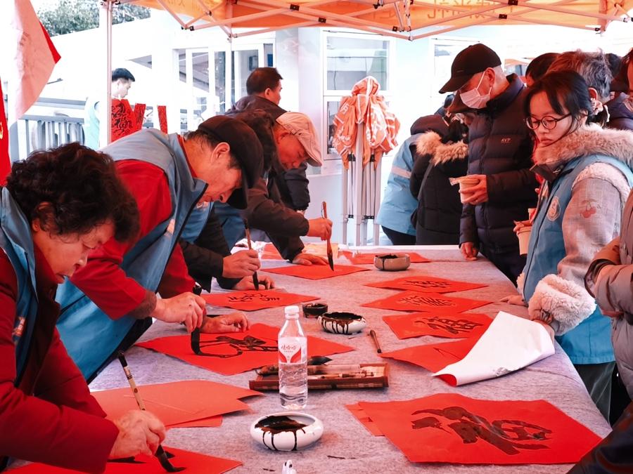 墨香撲鼻的“文明送福”區域,幾位書法家和書法愛好者正揮毫書寫“福”字。紅紙鋪展,筆墨酣暢,一幅幅風格各異的“福”字在現場傳遞。志願者小張在一旁協助鋪紙研墨:“今天能夠力所能及地服務市民,傳遞文明理念,特別有意義。”活動開始一個小時,幾百張手寫福字就被贈予市民,每一張都承載着誠摯的新春祝願。市民遊客接過現場書寫的福字,高興地說:“這比印刷的更有味道,把福氣也帶回家。”不少人現場把剛寫好的“福”字攤在一旁晾乾,成爲一道自帶“福氣”的人文風景。