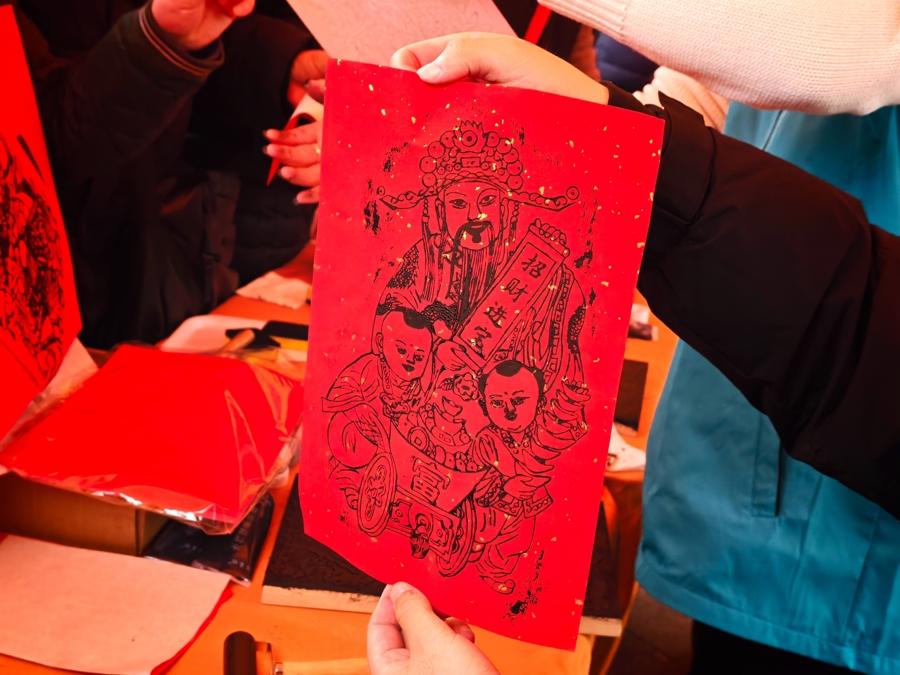 非遺傳承區內,“馬上有福”和門神、財神等木版年畫拓印,引得駐足觀看的市民遊客把攤位圍得水泄不通。“這樣的拓印比較少見,不僅好看,還能瞭解非遺文化。”還有一些市民遊客忍不住親手嘗試,在志願者的指導下,鋪紙、刷墨、拓印,製作出一張張寓意吉祥的版畫。