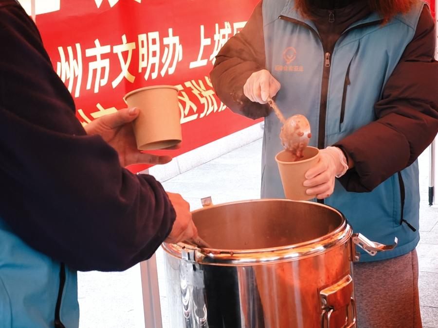“暖心粥鋪”前,志願者將臘八粥分裝在環保餐盒中,爲過往市民、環衛工人、外賣小哥、外地遊客等送上熱騰騰的臘八粥。市民陳女士剛領到粥就迫不及待地喝起來:“剛出地鐵就拿到了這麼暖和的粥,今年的臘八特別溫暖。”一旁的張大伯則把蓋子蓋緊,準備帶回家給家人喝。“我們昨天已經送了一批臘八粥,給交警、外賣騎手以及基層服務單位的工作人員等,讓這些一線工作者提前嚐到臘八粥的香甜。”現場負責人表示。