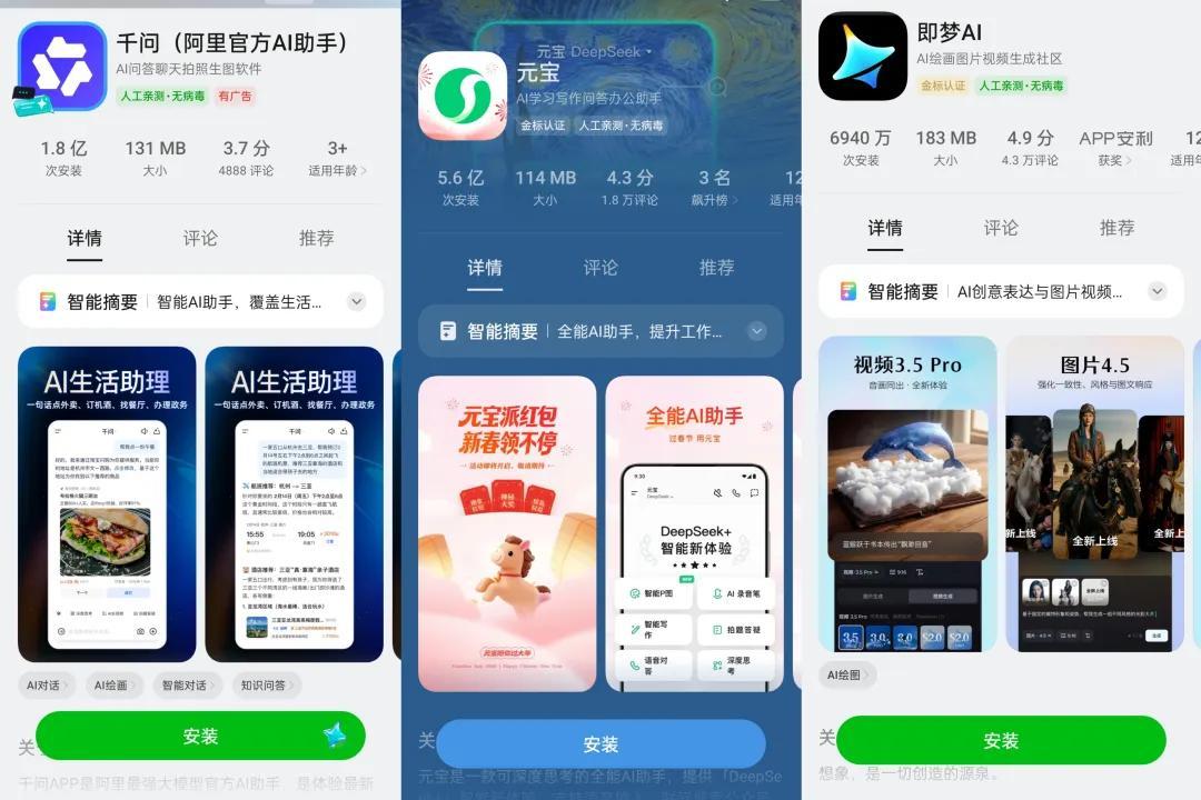 最直接的是營銷戰。根據DataEye研究院報告,2025年12月,原生AI市場中,投放素材量排名前五的依次是阿里千問、元寶、螞蟻阿福、豆包和AI抖音,佔據了大陸市場月投放素材量的96%。