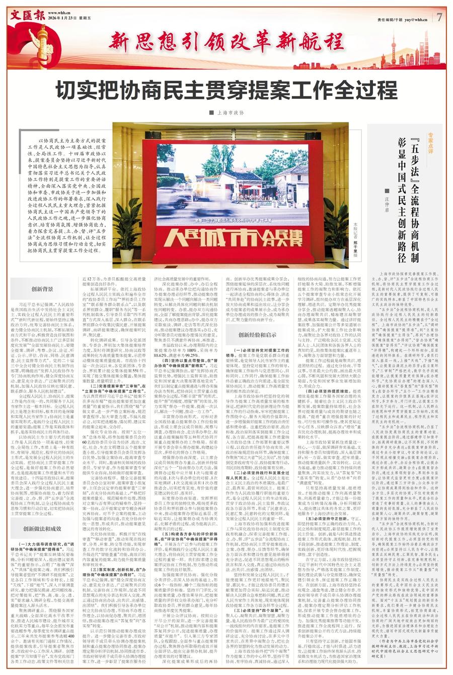 上海市政協探索完善提案工作提、立、辦、督、評“五步法”全流程協商工作機制,將協商民主貫穿提案工作全過程,是新時代人民政協踐行全過程人民民主的重要探索,提供了可複製、可推廣的實踐樣本,彰顯了中國特色社會主義民主政治的獨特優勢。