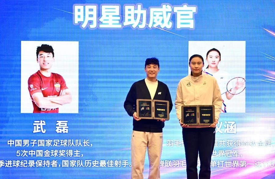 羽毛球世界冠軍王儀涵、上海海港足球隊前鋒武磊獲頒“2026上海城市業餘聯賽/上海大衆體育節明星助威官”紀念牌