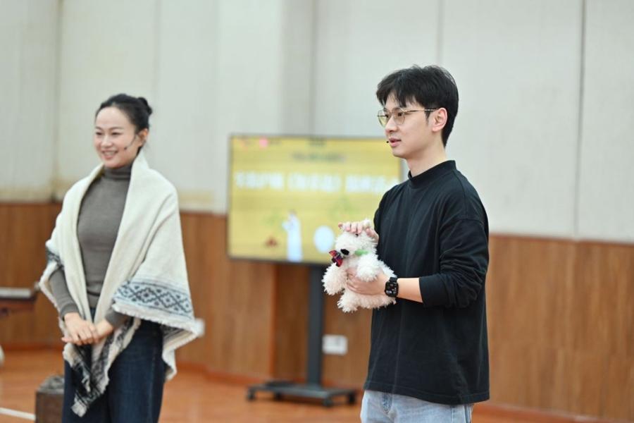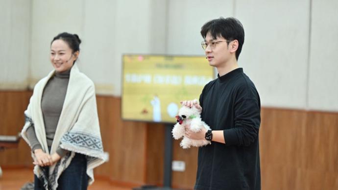此外,《短章邊》大膽嘗試引入“擬人化表演”,魯迅筆下的意象如“白光”“小狗”“門檻”都由真人演繹,這對演員提出了前所未有的考驗,也是本劇實驗精神的代表之一。物體的擬人化呈現需要兼具還原“物”之原型與引起“人”之共鳴,“原先我還以爲要在地上爬,但導演希望我表演更像人一點”,飾演小狗“阿隨”的吳暕波笑着對記者說,“但同時也會加入一些狗的特徵,”說罷他就惟妙惟肖表演了一番小狗被撓頭時滿足微笑的神情。更令人驚豔的是,吳暕波還將在劇中唱起滬語rap。原來,滬劇的招牌“清板”被改編成了年輕人喜愛的說唱。