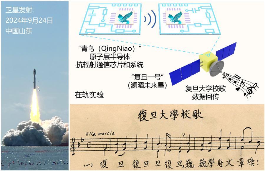 團隊基於單層原子厚度的二硫化鉬設計出了抗輻射射頻通信系統,即“青鳥”系統,並實現了4英寸晶圓級流片,能夠應用於星載通信。2024年9月24日,搭載着“青鳥”系統的“復旦一號”衛星在中國山東發射升空,進入距地球約517公里的低地球軌道。