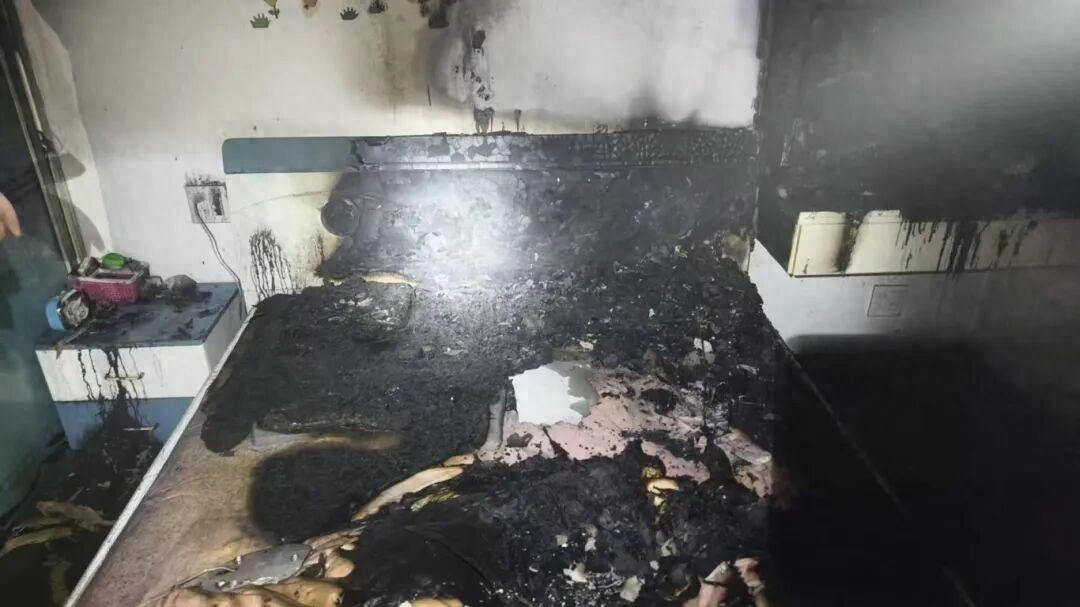 案例二:2024年12月28日,湖北武漢一小區一住戶使用電極式熱水袋充電時,引發電氣線路起火,猛烈火勢將整個臥室燒得面目全非,所幸住戶及時撤離,未造成人員傷亡。
