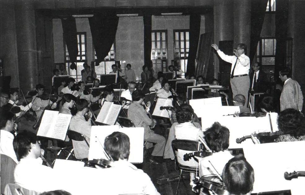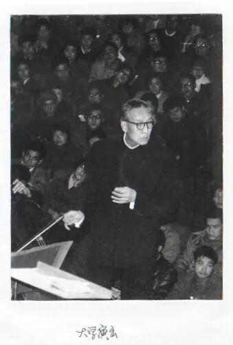 從1980年暑假開始,在黃貽鈞(上圖)的帶領下,上海交響樂團除了在正式的劇場裏安排普及音樂會,還跑了好多大中學校(下圖)。1981年2月25日,在上海師範大學,黃貽鈞親自向同學們一首首地介紹作品。也就在那一天,新華社說,在一年不到的時間裏,上海交響樂團跑了27所大中學校。1982年8月28日《文匯報》記錄,樂團連續舉辦了26場《世界名曲音樂會》,場場座無虛席,創造了交響樂專場演出的最高紀錄。