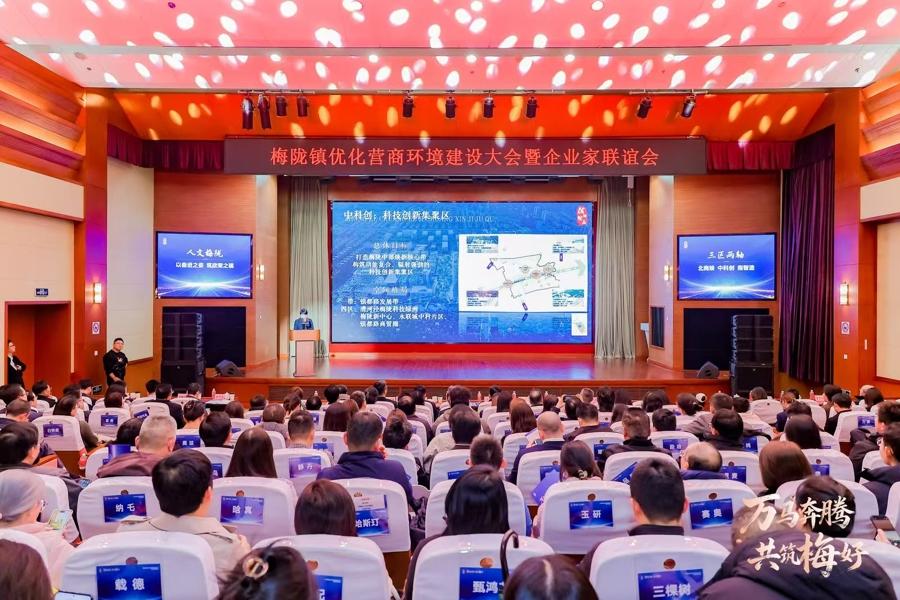 梅隴鎮今天召開“萬馬奔騰,共築‘梅’好”——2026年梅隴鎮優化營商環境建設大會暨企業家聯誼會。會上解讀了《梅隴鎮“十五五”規劃》,爲未來發展錨定方向;7家新入駐企業代表集體亮相,形成聚勢,開啓新程。