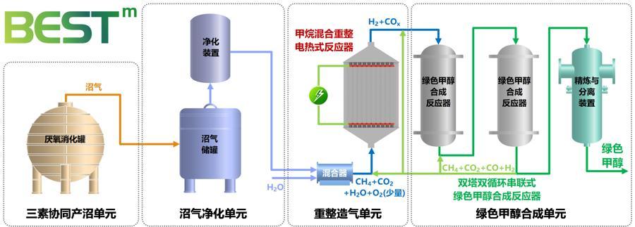 沼氣全碳轉化製備綠色甲醇工藝路線示意圖