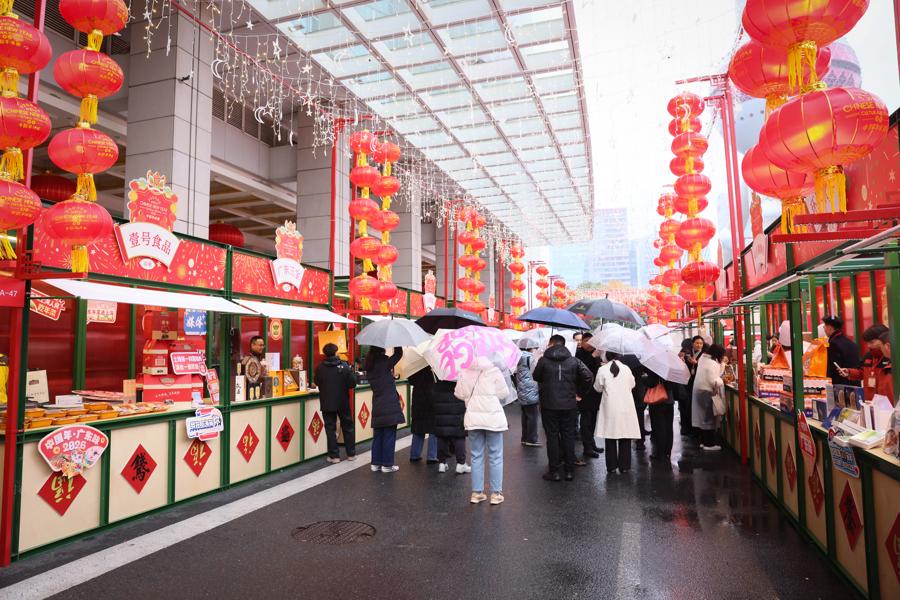 當天雖然下雨、體感溫度接近零度,但現場人聲鼎沸、年味升騰。“歡迎大家品嚐我們的豬腳姜。”江門市非物質文化遺產李氏豬腳姜製作技藝攤位前,工作人員傅莉莉一邊招呼顧客試喫,一邊現場科普起這項舌尖上的非遺——它始創於20世紀初,至今已歷經四代人的傳承。製作過程中不加一滴水,以醋替代,所用粉姜爲當地特有,慢煮、關火、讓食材在醋汁中充分浸泡,如是往復數次,做出來的豬腳姜方能酸香軟糯。