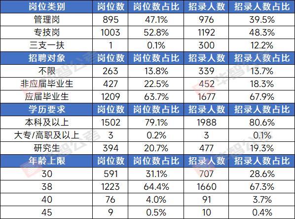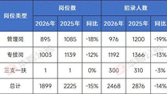 華智公考教師張婷分析,今年整體縮招約15%,崗位數量減少326個,招錄人數減少408人。其中,專技崗居多,招錄人數爲1192人,佔總人數約52.8%,同比減少13%;管理崗共招錄976人(不含三支一扶崗位),約佔總人數的39.2%,相較去年的1200人,縮減幅度較爲明顯,將近20%。此外,三支一扶崗位共計招錄300人,相較去年小幅縮招。從招錄條件來看,應屆畢業生崗位較多,共招1677人,佔比約67.9%。報考學歷以本科爲主,也有少數爲大專/高職。同時,部分崗位的年齡上限放寬至38週歲,這也意味着競爭可能更加激烈。