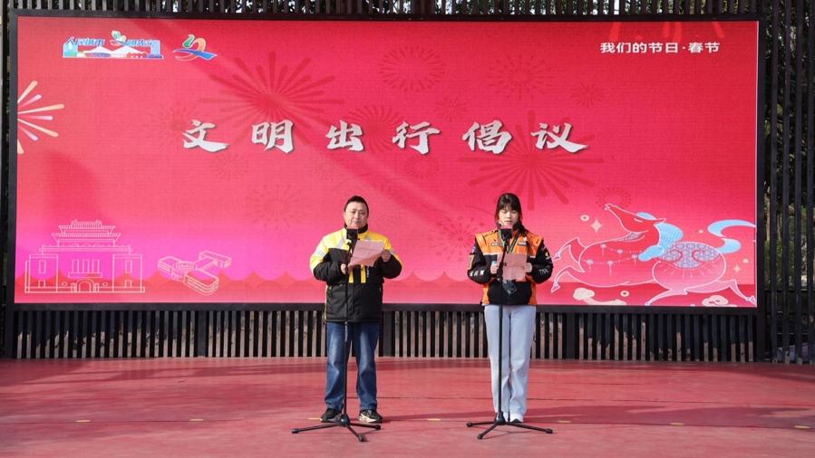 “做文明騎行的示範者,做城市安全的流動哨,做友善互助的傳遞者!”美團江灣站騎手李穎浩、淘寶閃購中原路站騎手餘彩霞嗓音洪亮宣讀《騎手文明出行倡議書》,新就業羣體與城區雙向奔赴的溫情在現場洋溢。今天,楊浦區長海路街道2026年迎新遊園會暨“情暖騎手 新春同行”主題活動在黃興公園舉行,邀請多位騎手代表參與活動。