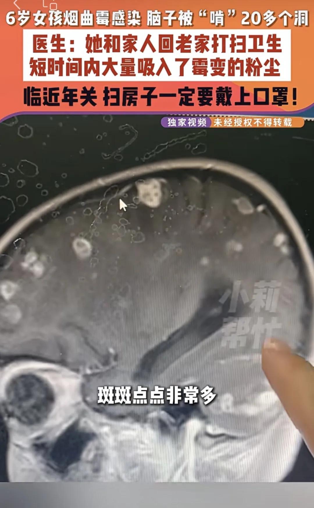 鄭州大學第一附屬醫院兒童重症監護室副主任醫師霍玉峯介紹,這個女孩是煙麴黴導致的感染。當時孩子隨家人回長期空置的老房子打掃衛生,短時間內吸入房子中大量黴變的粉塵,致使真菌侵入血液並擴散至腦部。