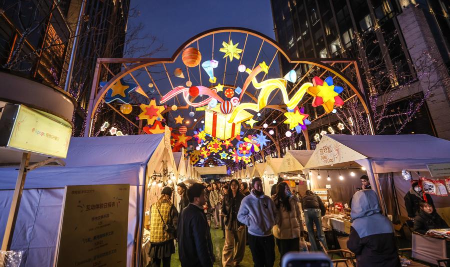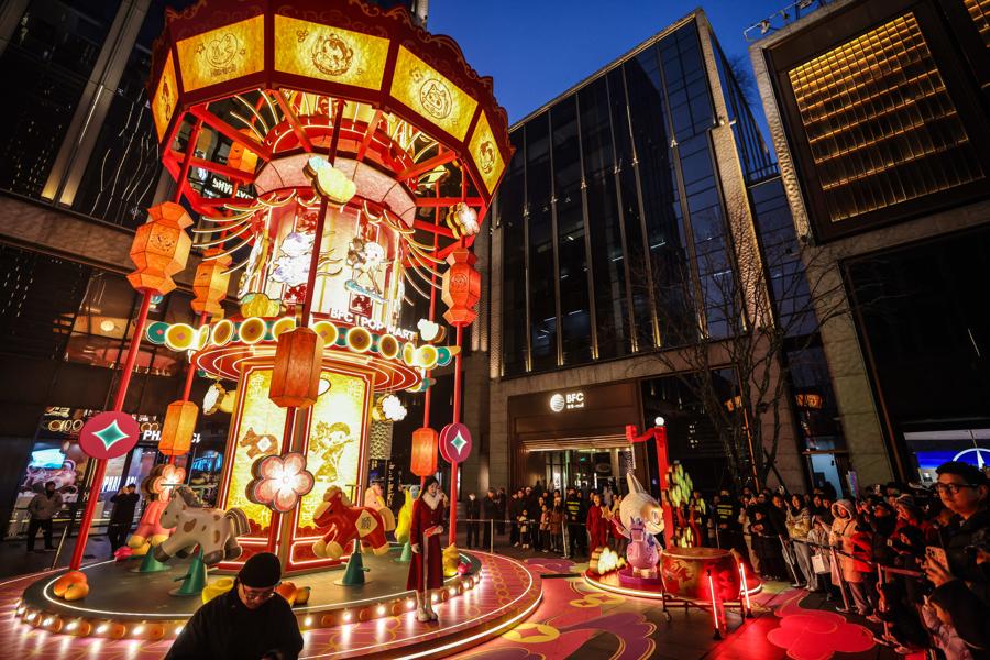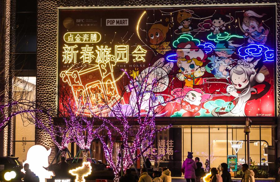 新春的歡愉蔓延至街區,外灘楓涇路化身爲一條璀璨的“國風燈影長廊”,在漸變柔和的燈光下營造出一片可漫步賞燈的詩意氛圍。而在BFC上街沿,IP的萌趣世界悄然降臨,各式點金奔騰燈組錯落分佈,將整片街區的煙火氣浸潤在可愛與溫暖的氛圍之中,成爲新春佳節不可或缺的亮色!