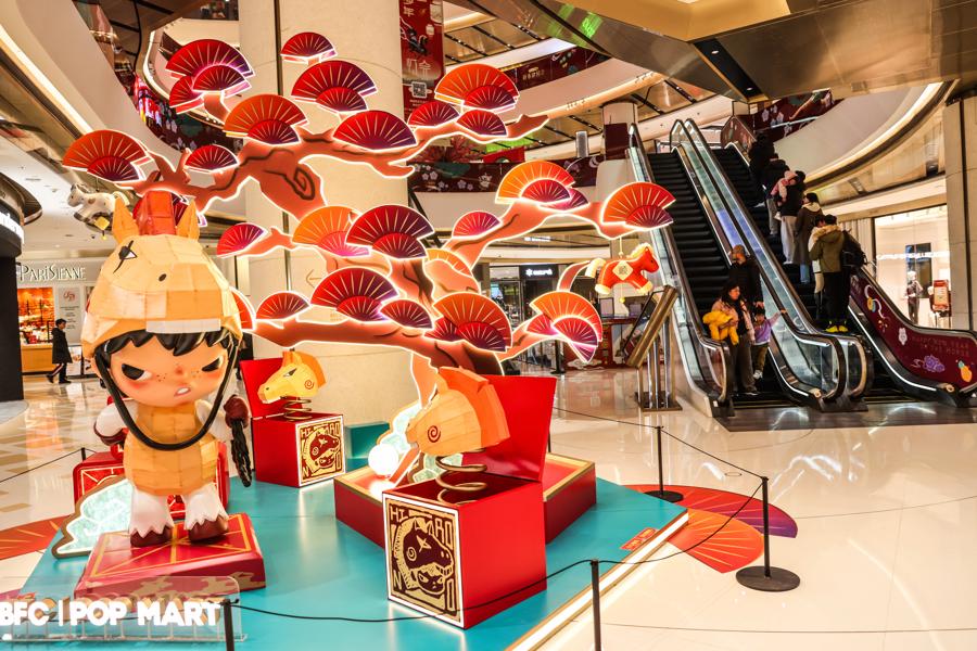 作爲本次燈會的亮點之一,BFC風尚潮流燈區聯合泡泡瑪特打造潮流年味新體驗。2月1日起,泡泡瑪特新春遊園會空降外灘。BFC北區廣場,一座別出心裁的宮燈旋轉木馬裝置瞬間點亮新春夜空,傳統宮燈的硃紅飛檐下,暖黃燈箱勾勒出12個泡泡瑪特經典IP形象,宛如將童話藏入中式畫框。下層木馬在光影中交織出馬年的奔騰意象與喜慶的年節氛圍。宮燈一側,LABUBU的萌趣燈組與旋轉木馬相映成趣。