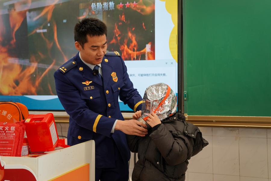 金山區消防救援局消防人員戴詩彬針對小學生好奇心強的特點,採取互動問答的方式,講解怎樣預防火災、認識火災和火場逃生等常識。學生們還現場體驗消防器材,加深對消防安全知識的記憶。