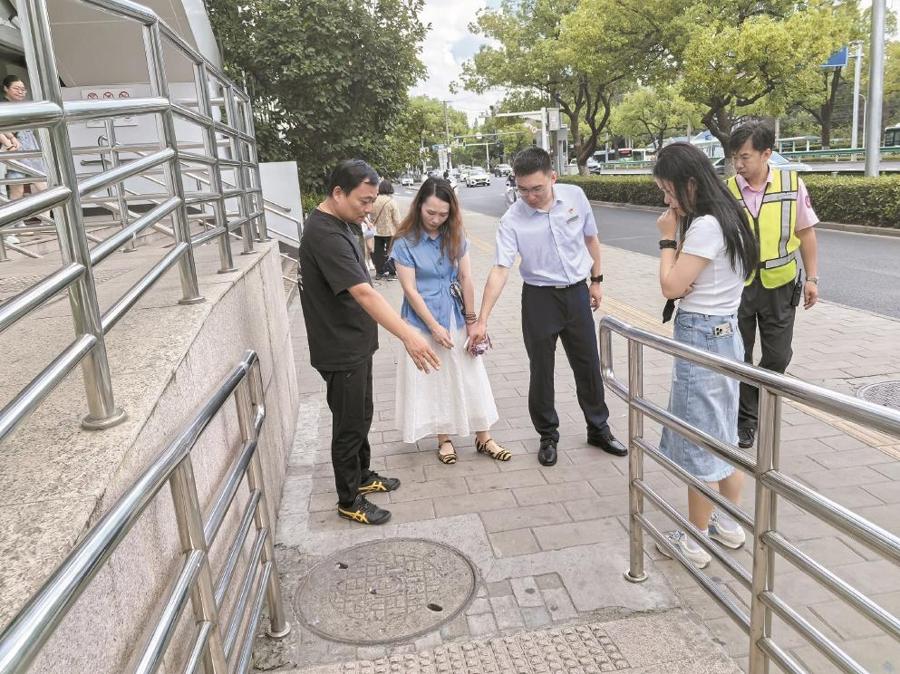 去年8月11日,問題在黨建聯席會議上被提出。一週後,城建中心、申通地鐵公司等各方便被召集至現場,召開了一場高效的“一站式”協調會。權責在現場得以清晰釐定:城建中心負責按規範鋪設盲道,申通地鐵配合銜接並參與停車整治,網格則全程跟蹤並動員志願者。
