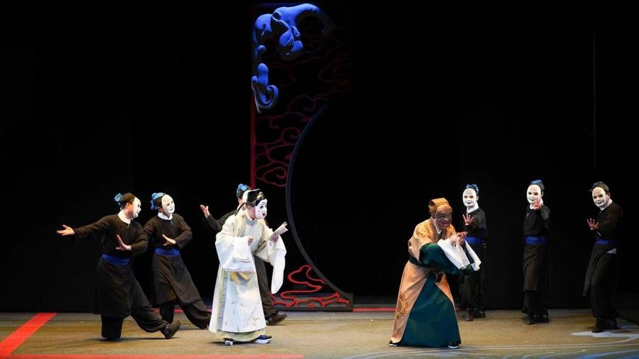 除了劇本念詞、唱腔和版式,該劇的音樂也借鑑融合了其他戲劇類型的特點。劇中馬小姐和貢老爺曾有一段舞臺共舞,京劇表演中竟出現了三拍子的唱段。“那段表演在排練時借鑑了舞蹈的節奏感,同時融入了崑曲的部分身段動作。”飾演貢老爺的梅慶羊介紹道。主創團隊在舞蹈與音樂設計上借鑑了諸多兄弟劇種,甚至跨界藝術元素,但都巧妙化用到《吝嗇鬼》的舞臺上,讓人感覺貼切而不突兀。