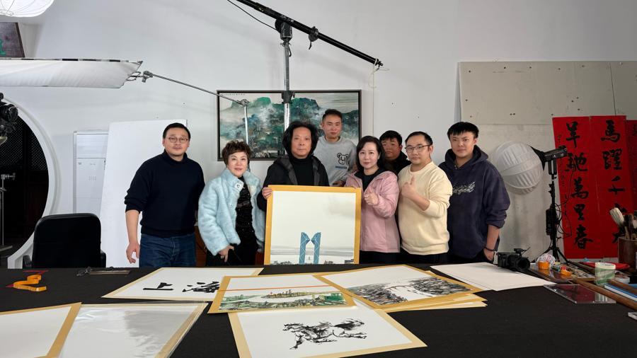 兩層樓高的畫室裏,9盞大燈發出明亮而柔和的光,在燈光圍合的中心,一張巨大的書桌邊,畫家正從容落筆,聚精會神地在畫紙上潑墨、皴染、勾勒……一幅幅氣韻生動的“城市山水”“煙火人間”,在尺幅間顯影而出,或氣勢磅礴,或婉約秀美,或精微雋永,或意趣橫生。這裏就是上海“十五五”規劃手繪水墨AI動畫《上海Run Up》的拍攝現場,影片中的16幅手繪水墨畫就在這裏一氣呵成。
