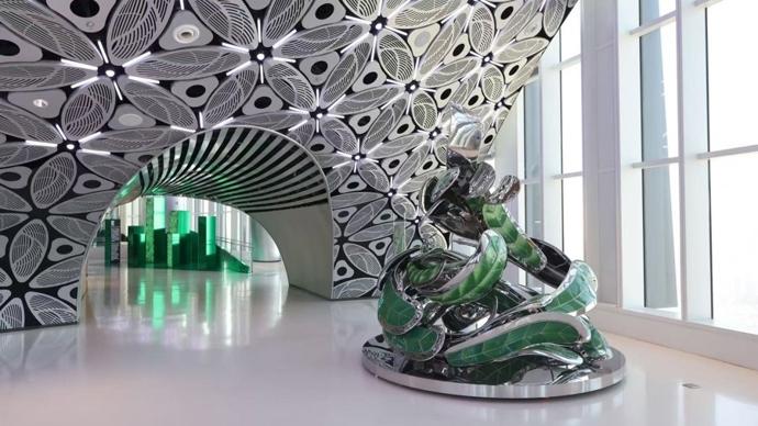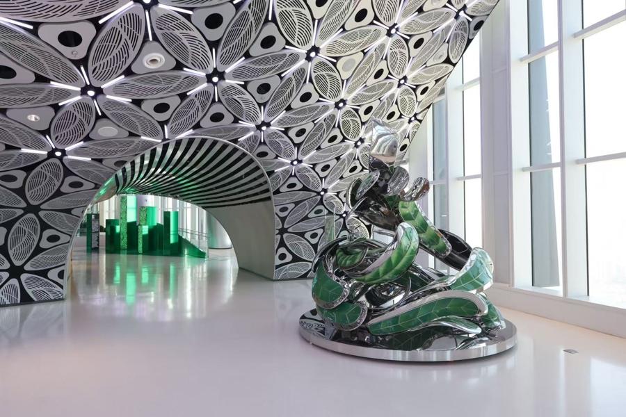 據悉,該作品由中國工藝美術大師蔣國興創作,以“二十四番花信風”爲靈感,融入上海市花白玉蘭與中華蜜蜂的意象,既暗藏地域文化底蘊,深化遊覽的精神體驗及情感聯結,又傳遞人與自然和諧共生的生態主張,爲空間注入溫潤的人文氣息。作品採用不鏽鋼與陶瓷雙材質打造,以剛柔相濟的質感融入環境,螺旋上升造型搭配釉色漸變設計,既呼應了高空光影流轉的視覺體驗,又暗合了清潔能源轉型的生態理念,細節處的工藝巧思更爲觀光廳增添了可品味的藝術質感,實現了空間美學與核心主張的深度融合。