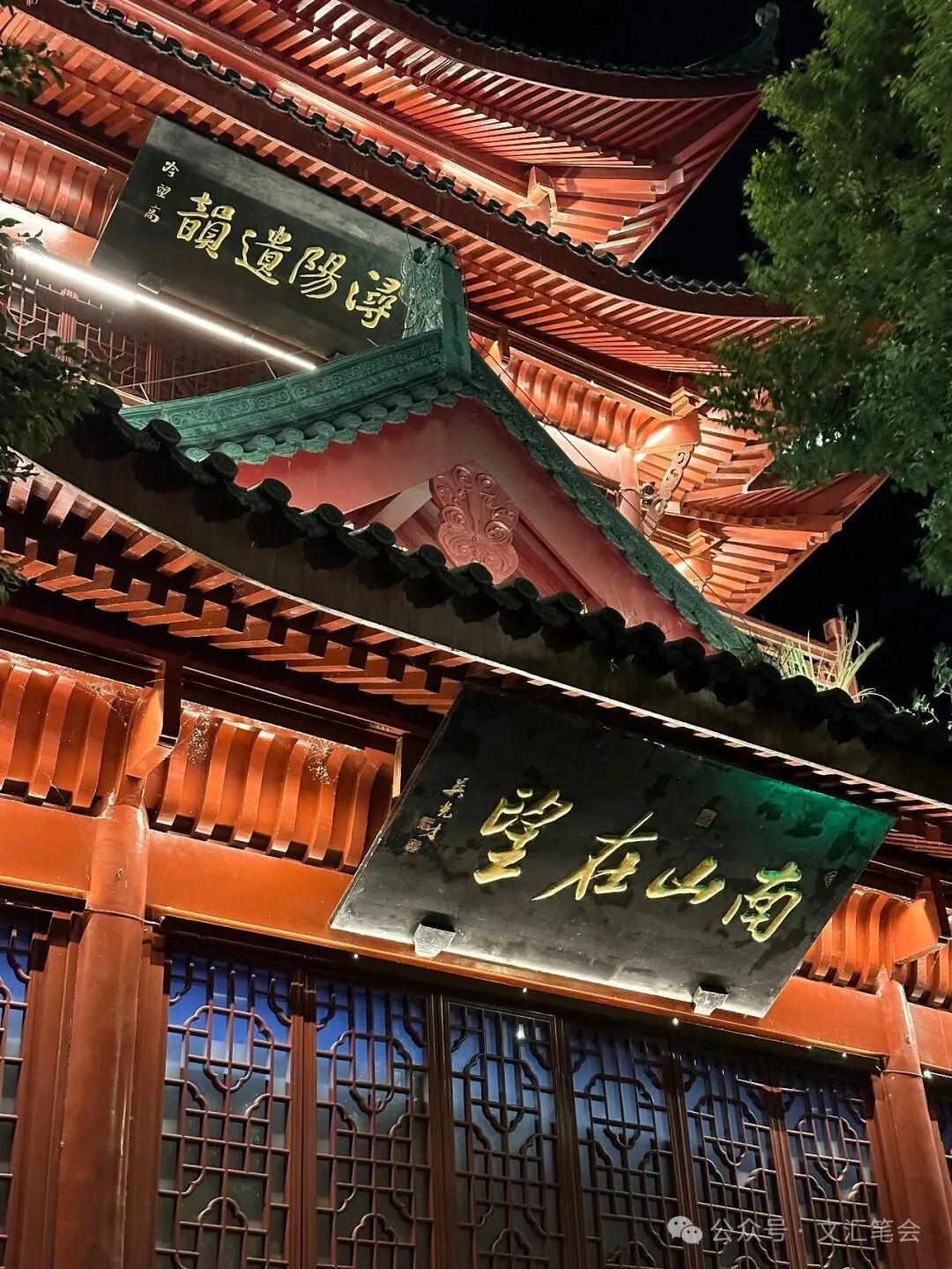 我在傍晚六點半踏上江堤步道,想懷古幽思白居易夜聽琵琶吟的情景。夜幕正在落下,江風將一個嘶唱露天卡拉OK的男聲吹得四處飄蕩:“愛上你讓我神魂顛倒,想你想得睡不着,忘記你我做不到……”大哥用破音唱出了痛徹心扉,強勢地阻止了我對琵琶吟的努力懷古。江邊的人們步伐緩緩,散步的散步,鍛鍊的鍛鍊,一旁的馬路上車來車往。一年裏走上街頭不足五次的我,就像走進一場電影,彷彿看到擦肩而過的路人頭頂上,不斷飄落着絢爛的煙花。正當我要沉沒在這紅塵裏的瞬間,腳下抵達了一座被夜景燈照得猶如仙境的樓閣,上面現出一塊寧靜的牌匾,寫着四字:“南山在望。”