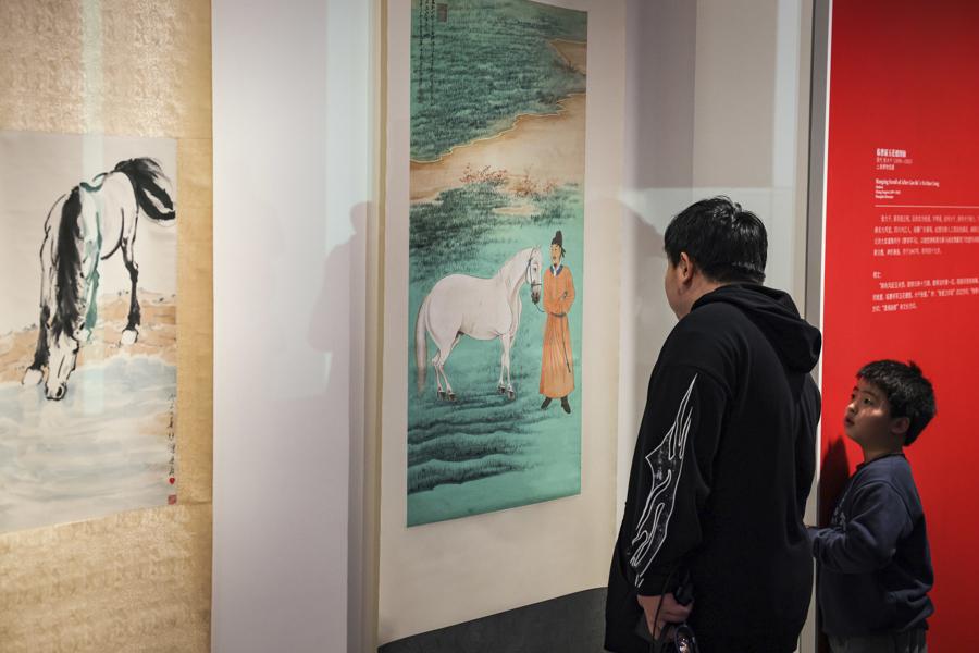 馬在中國古代社會中地位重要,深受人們喜愛,因而也成爲藝術創作中常見的表現題材。咸陽博物院藏圓雕白玉仙人奔馬,爲漢代玉器圓雕中的珍罕之作。它以新疆和田羊脂白玉雕成,將天馬與仙人意象完美結合,形象詮釋了漢人“天馬行空”的浪漫想象與“羽化登仙”的永恆祈願。一組來自上博的小型陶瓷馬像造型生動、釉彩各異,體現了民間窯口的質樸趣味與生活氣息。其中一件宋代紅綠彩騎馬女像以紅、綠、黑彩繪飾,女子騎姿端莊,再現了宋金時期女子出行的嫺雅風姿。平時難得一見的徐悲鴻《飲馬圖》與張大千《臨曹霸玉花驄圖》,則讓人們體會墨韻流淌中的馬魂風骨。