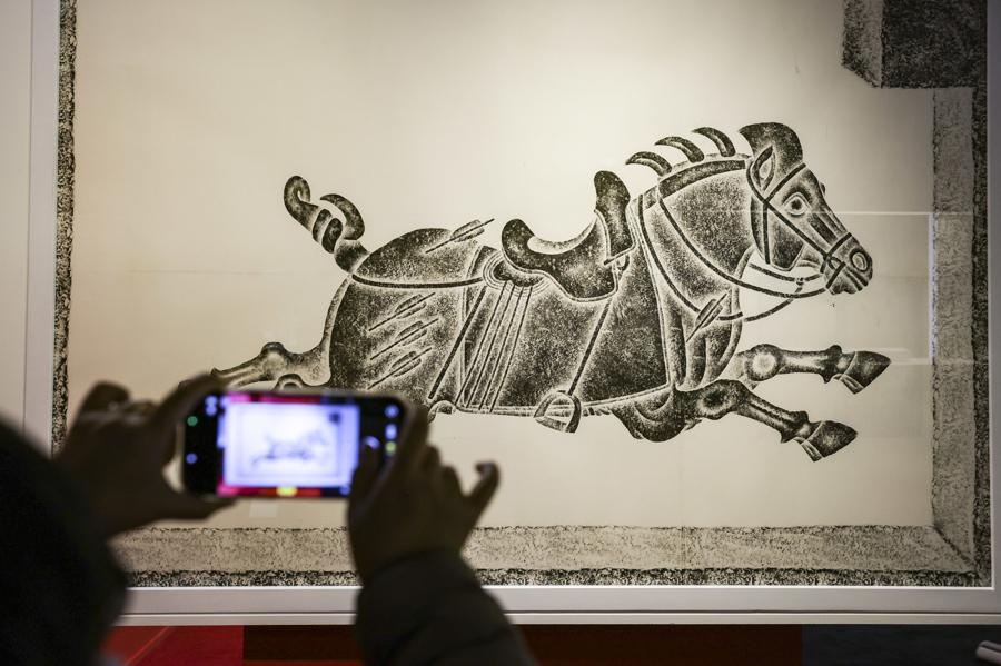 上博藏昭陵六駿石刻拓印,則定格了唐代戰馬的威武儀容。昭陵六駿是唐代石刻藝術不朽的典範,然而,出於歷史原因,其中的“颯露紫”和“拳毛騧”流失海外,現藏於美國賓夕法尼亞大學博物館。“此次展出的昭陵六駿全套拓本雖非直接取自原石,但形制比例、氣韻神采皆極近原跡,是近代拓工技藝與文物傳承的重要物證。”褚馨說。