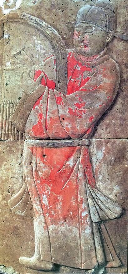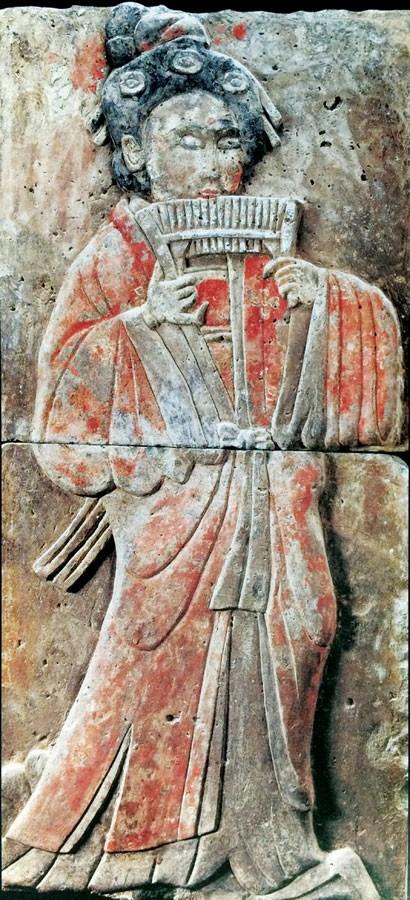 五代時期節度使馮暉墓彩繪浮雕磚:上圖爲排簫女伎,下圖爲箜篌男伎