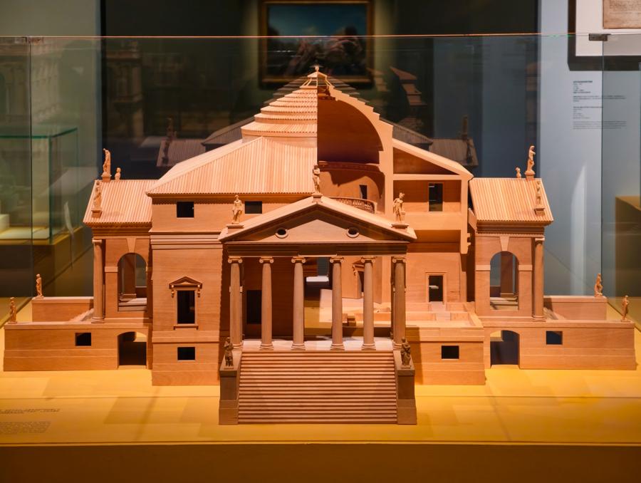 展陳突破傳統模式,融合雕塑、繪畫、模型與圖紙等多元展品,將帕拉第奧的建築比例邏輯融入空間設計,以剋制色彩呼應古典理性美學內核。圓廳別墅、帕拉第奧巴西利卡等經典建築模型及密涅瓦神廟立面圖等手稿,生動還原大師的設計巧思,其中圓廳別墅以絕對對稱格局與自然共生理念,成爲文藝復興建築的典範。