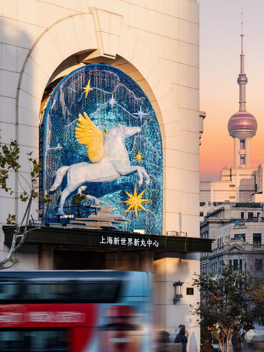 值得一提的是,商業與文化交融,爲新春消費注入獨特韻味。商場全新推出馬年大型藝術裝置《星翼丙午》,以二十八星宿中的“星日馬”爲原型,將古老星象符號與現代設計結合,打造兼具未來感與神聖感的公共藝術作品。該裝置高逾4米,採用低多邊形造型語言,主體爲“星空藍”,翅膀漸變爲“晨曦橙”,內置光源夜間自內而外發光,與城市霓虹交相輝映,成爲滬上新年打卡新地標,讓市民在購物之餘,感受馬年新春的文化氣息。