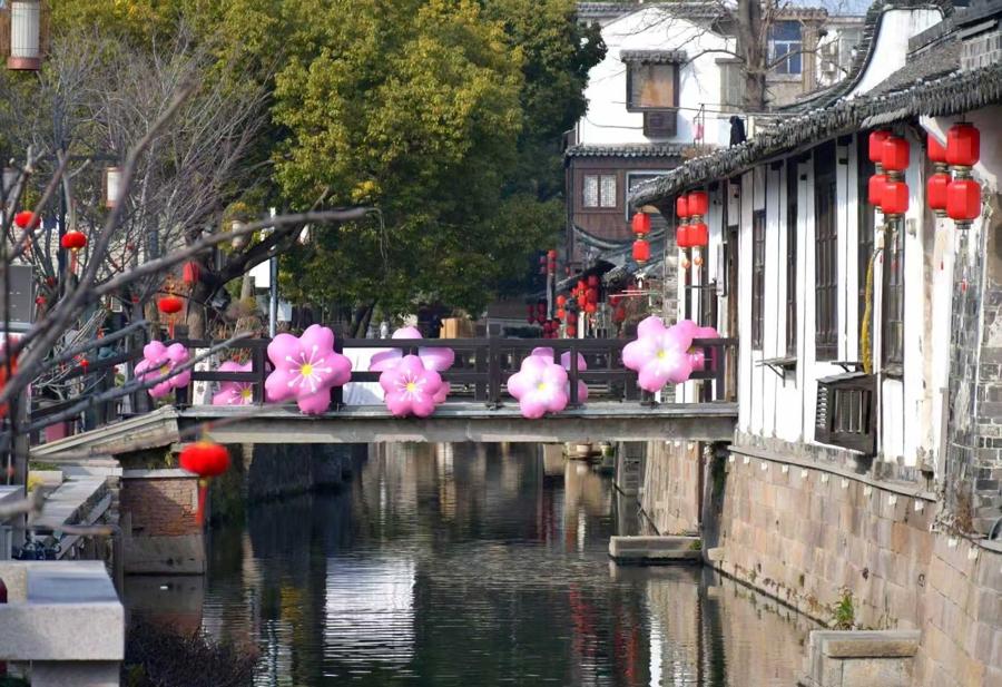 後市河上的一座座石橋,裝點上了愛心、桃花、花燈等各種飾物。河道內的遊船也粉飾一新,等待着市民遊客前來搭乘,更有花船夜遊,供市民遊客打卡感受江南水鄉的柔情似水。位於後市河和包橋港交匯處的“七橋風月”節點,則在水面上打造了一盞巨大的燈籠,與附近橋上的一組組小燈籠在夜幕中交相輝映。