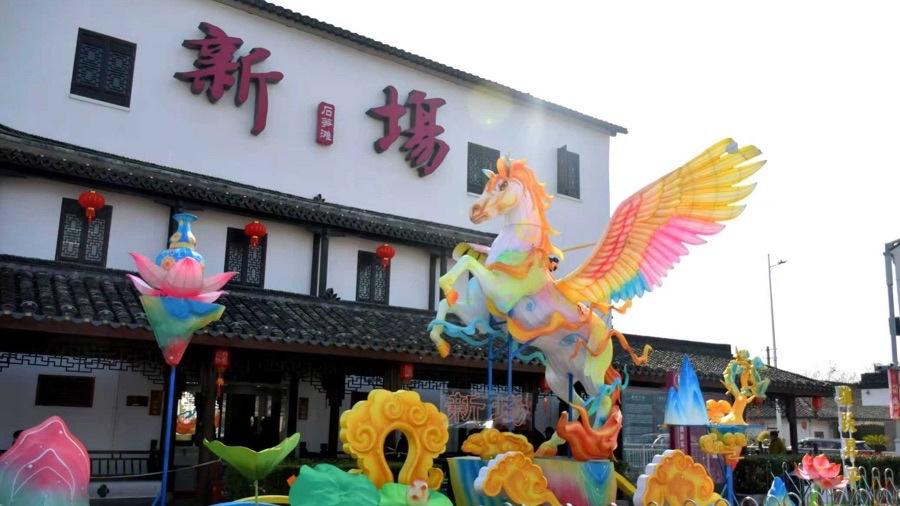 遊客中心和開新文體公園的馬年主題彩燈、南大門的發財鈴、鹽池疊雪廣場的浪漫布景、新場大街79弄里巷的趣味打卡牆……漫步新場古鎮,處處藏着“馬上好運”“快樂加馬”的巧思。