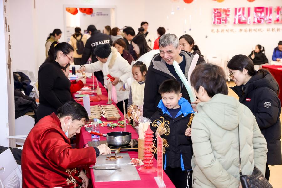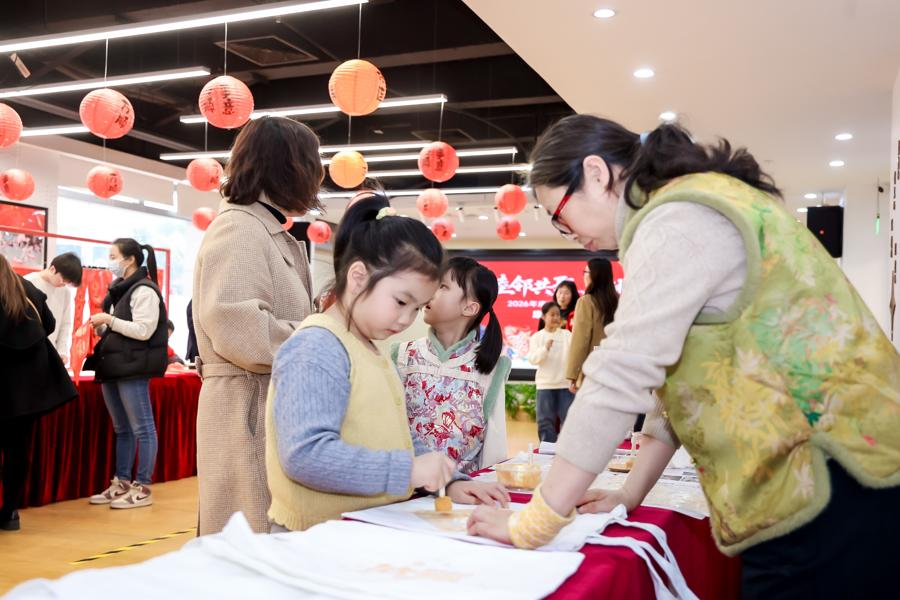 一旁的廣場上,康橋有喜“市”匯聚人氣,成爲一片歡樂的海洋。“康橋萬家福”心願牆前,居民們爭相懸掛寫滿祝福的卡片,共同織就一幅溫暖的社區祈願圖景。非遺體驗區裏,糖畫藝人以糖爲墨,手腕流轉間勾勒出靈動的生肖圖案,吸引孩子們目不轉睛;剪紙巧手紅紙翻飛,頃刻剪出吉祥紋樣;書法臺前墨香四溢,書法家協會的老師揮毫潑墨,一副副飽含祝願的春聯和“福”字被居民欣喜地接過,一旁的“大衆書寫臺”也吸引不少居民一試身手,體驗筆墨之趣。