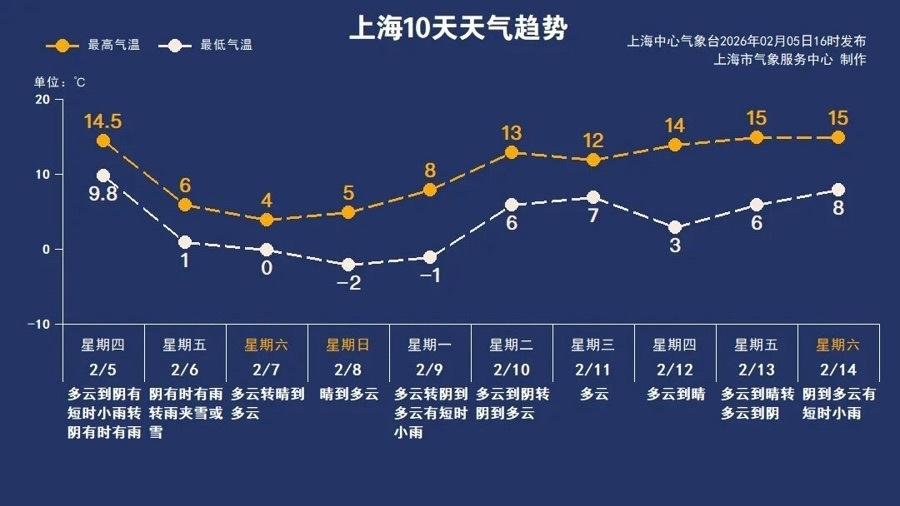 據預測,下週上海是“兩頭陰雨中間晴”的天氣,氣溫整體有所回升,週中後期最高氣溫在12℃至15℃之間。