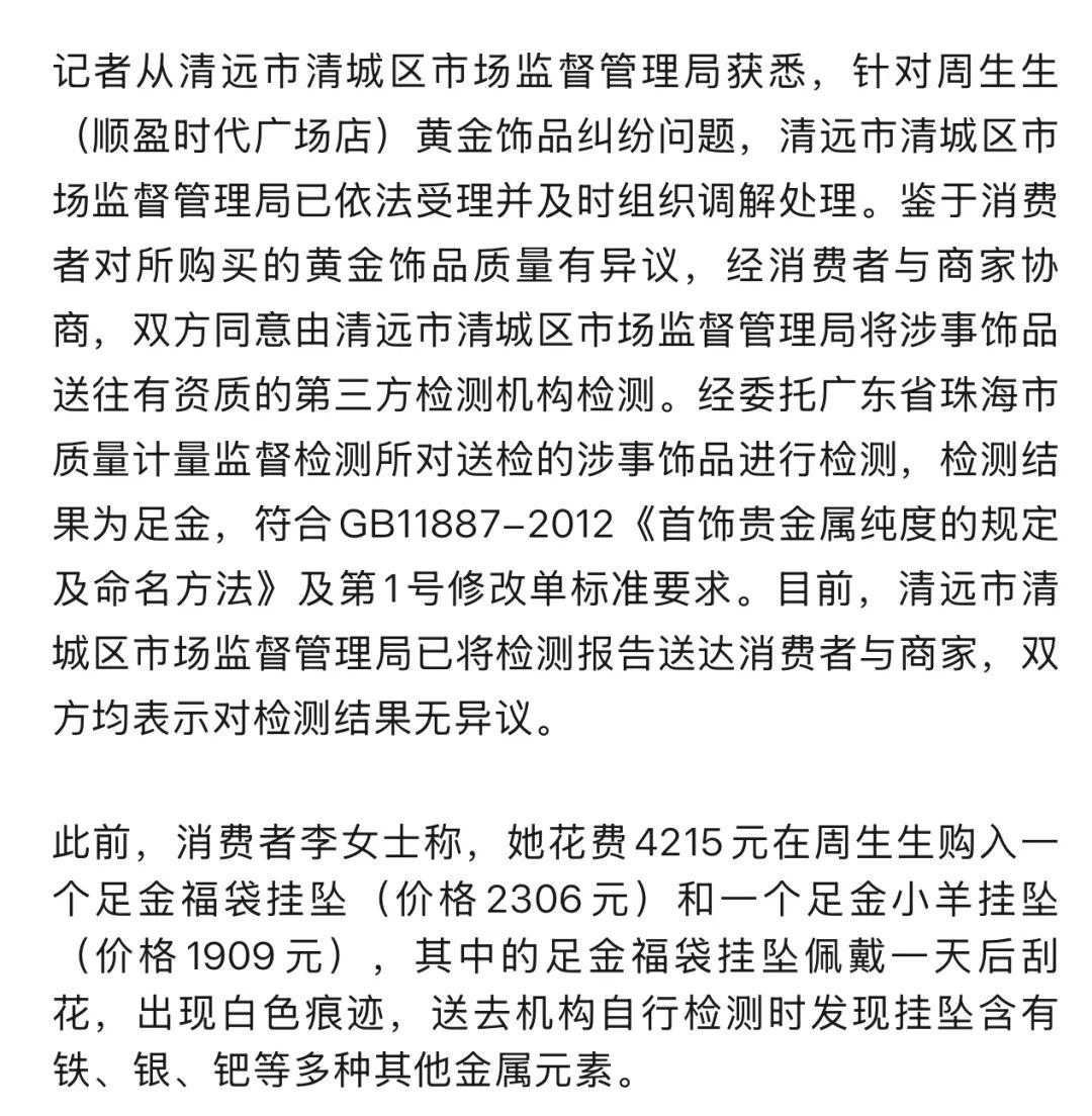 “周生生掛墜金含量”官方檢測完成:爲足金,雙方無異議