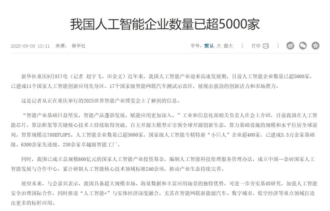 與此同時,大量普通創業者湧入AI賽道。2025年9月,中國工業和信息化部副部長辛國斌披露:中國人工智能企業超5000家,是五年前1454家的3倍多。