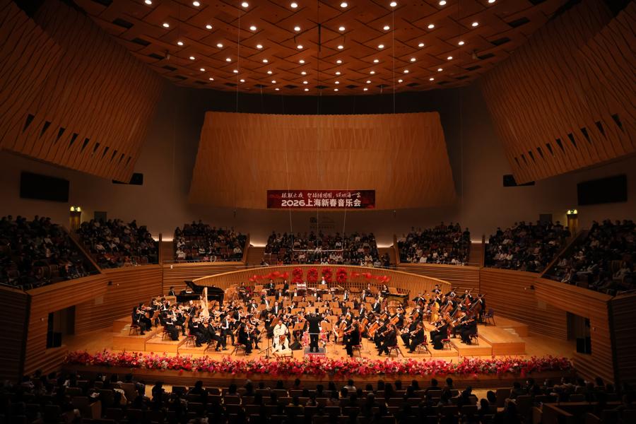 2月6日晚,捷豹上海交響音樂廳內年味濃,2026上海新春音樂會在此熱鬧奏響。音樂總監餘隆執棒上海交響樂團,攜手二胡演奏家姜建華、男中音歌唱家廖昌永、青年女高音歌唱家顧文夢、小提琴新星章奧哲及馬頭琴與呼麥演奏家哈斯巴根,以一場薈萃中西、貫通古今的音樂會,將新春祝福送抵樂迷心間。