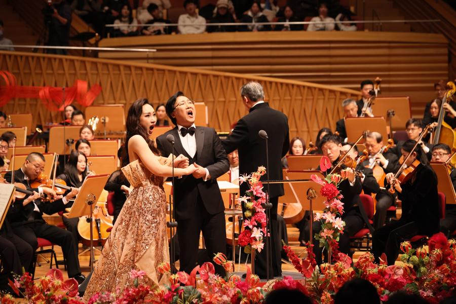 在古典詩詞與現代音樂的交融中,男中音歌唱家廖昌永深情演繹陸在易作曲的《水調歌頭·明月幾時有》。“哪怕遠隔千山萬水,天下華人都是一家,共賞一輪明月,思念一方水土。”廖昌永以醇厚嗓音傳遞蘇軾詞作中的情感。他還獻唱羅西尼歌劇《塞維利亞的理髮師》選段《快給大忙人讓路》,歡快旋律與新春氛圍相得益彰。青年女高音歌唱家顧文夢則以《愛人送我向日葵》展現中國藝術歌曲的浪漫細膩,丁善德筆下的旋律經她演繹,將姑娘收到向日葵的喜悅與思念刻畫得入木三分。她與廖昌永聯袂獻上《風流寡婦》選段《相對無語》,二人的深情對唱與優雅的舞步,令人印象深刻。