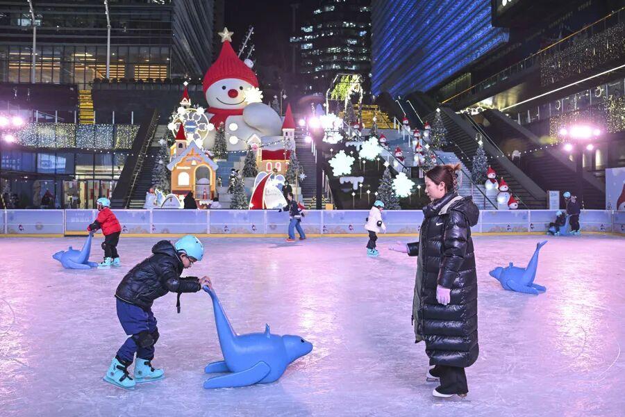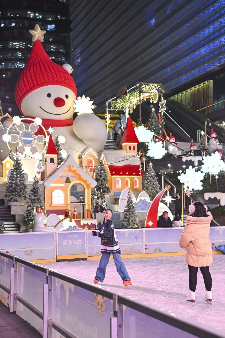 陸家嘴中心L+Mall下沉廣場變身雪上樂園,都市樓宇與紅帽雪人相映成趣