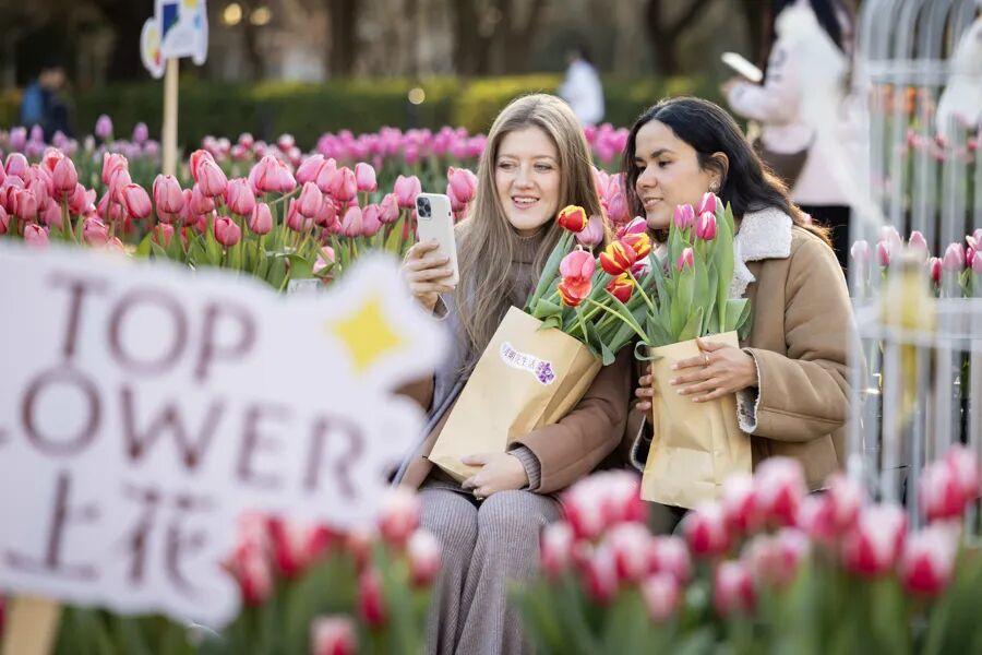 “復興·思南年宵花市”超600平方米的鬱金香花海絢麗綻放,生機盎然